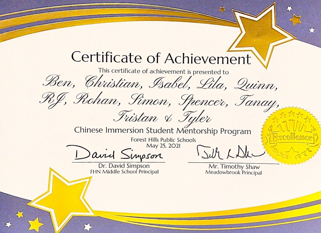 The Forest Hills Public School Chinese Immersion Parent Advisory Committee is excited to launch a 6-week student mentorship pilot program. This mentorship program allowed 8th grade students to work with the younger students at Meadow Brook Elementary School.