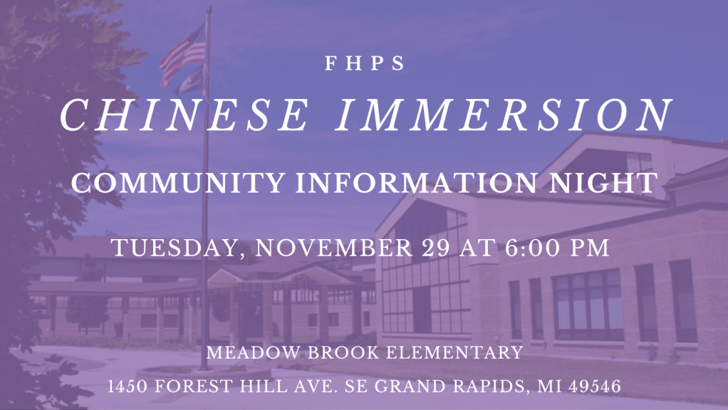 Forest Hills Public Schools would like to extend a special invitation to all preschool directors & teachers to learn about the district’s K-12 Mandarin Chinese Immersion Program during our Community Chinese Information Night on November 29that 6 pm.